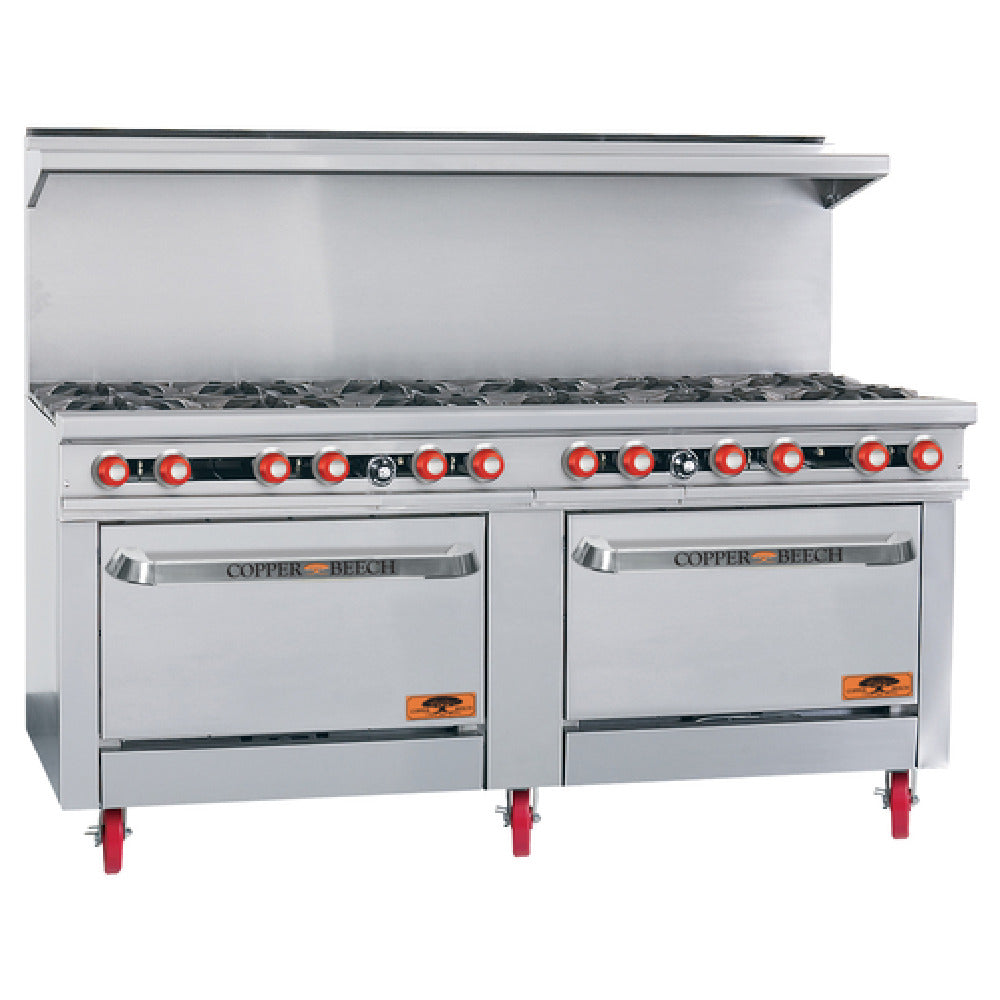 The Copper Beech PCBR-10 Restaurant Range Natural Gas 60"W stands as a high-performance kitchen appliance designed for professional culinary environments. This restaurant range features ten robust 30,000 BTU open burners, each equipped with durable cast iron burners and grates, providing exceptional heat output for diverse cooking needs. The unit's design includes dual 26.5-inch standard ovens, both thermostatically controlled to ensure precise temperature management, and insulated oven doors to maintain energy efficiency. Each oven houses a U-shaped burner and comes with four racks, allowing for versatile cooking arrangements. Constructed with a stainless steel front and back riser, complemented by galvanized sides, this range is built for longevity and ease of cleaning. Mobility is enhanced by six casters, making it convenient to reposition within a kitchen layout. The 3/4" NPT rear gas connection supports its substantial 362,000 BTU capacity, while cETLus and ETL-Sanitation certifications affirm its compliance with safety standards. Manufactured in the USA, this restaurant range exemplifies quality and reliability, making it an indispensable asset for segments within the foodservice industry seeking powerful and durable cooking solutions.