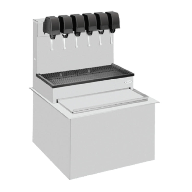 The Cornelius 631100057 CB2323 High Performance Post-Mix Soda Beverage Dispenser Drop-in is a premium choice for establishments looking to efficiently serve a variety of beverages. This ice-cooled dispenser comes equipped with eight UFB-1™ lever valves, providing flexibility and variety in drink offerings. Its substantial 100 lbs. ice capacity ensures that operational demands are met during peak hours. The built-in drip tray helps maintain cleanliness, making it a practical addition to high-traffic environments. Featuring a 5-2-1 carb/non-carb manifold, it can cater to different beverage preferences, offering both carbonated and non-carbonated options. With a robust 9-3/4" cup clearance, it accommodates a range of cup sizes, enhancing convenience for users. The unit's stainless steel tower, devoid of any merchandiser elements, signifies durability and a sleek appearance, fitting seamlessly into professional settings. It requires a 23-1/4" x 23-1/4" cutout for installation, aligning with industry standards. Operating on a 120v/60/1-ph electrical system with a 1.5 amp rating, this dispenser is both efficient and compliant with UL and NSF certifications, ensuring safety and quality for commercial usage. Its design and functionality make it a versatile tool for various market segments in the beverage industry.