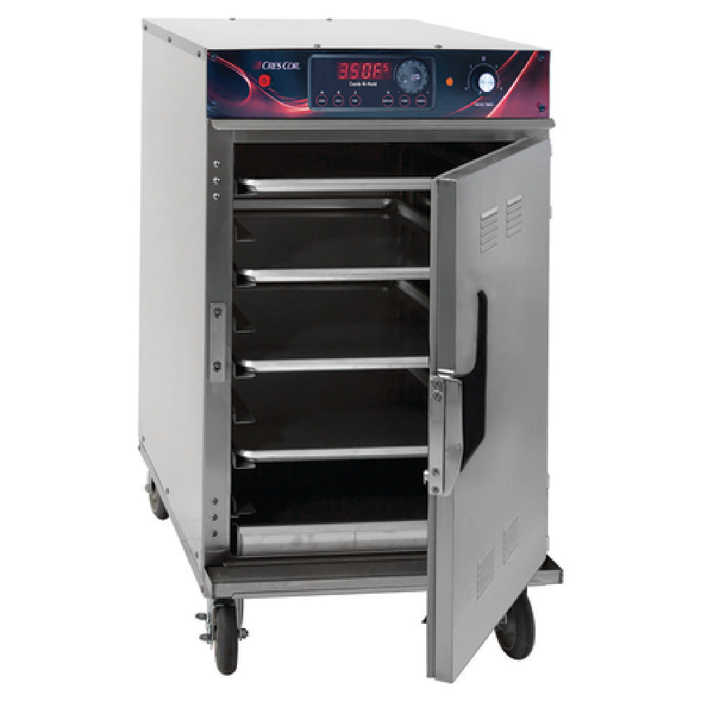 The Cres Cor 1000CHSKSPLITSTKDX Cook-N-Hold Low Temp Smoker Cabinet is a versatile appliance designed to meet diverse culinary needs with its mobile, stacked configuration. This insulated unit features a removable stainless steel pan capable of accommodating up to 16 pans measuring 18" x 26" on 3" centers, complemented by three stainless steel wire grids of the same size. The deluxe LED oven controls provide 18 programmable menu options, including a food probe cooking system complete with a 6" probe, offering precision and ease in culinary operations. The cabinet is engineered with a field-reversible door, facilitating flexibility in kitchen layouts. Its cook and hold cycles ensure culinary perfection, while the anti-microbial latch promotes hygiene. Constructed with a stainless steel interior and exterior, it boasts a vented chip box for enhanced smoking capabilities. Mobility is ensured with four 5" swivel casters, two of which are swivel and two are rigid, providing both maneuverability and stability. The Cres Cor 1000CHSKSPLITSTKDX is certified by cCSAus and CSA, affirming its adherence to rigorous safety and performance standards. This smoker cabinet is an indispensable asset for professional kitchens seeking dependable, high-capacity cooking solutions.