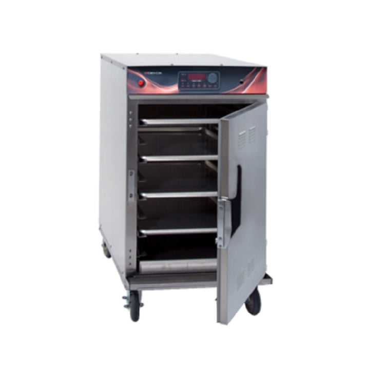 The Cres Cor 1000CHSSSPLITSTKDX Cook-N-Hold Cabinet Mobile Stacked is a state-of-the-art culinary solution designed for professional kitchens. This mobile, stacked cabinet leverages radiant heat and insulation to maintain precise temperature controls. The unit features two separate thermostats: one for holding temperatures between 140°F and 200°F, and another for cooking temperatures ranging from 140°F to 325°F. With a capacity to hold up to sixteen 18" x 26" angle pan slides on a 3" center, accompanied by six wire grids, it offers versatile cooking and holding options. The deluxe LED oven controls, with 18 programmable menu options and an integrated food probe cooking system (including a 6" probe), ensure precise cooking control. The cabinet's design includes field-reversible doors with magnetic and anti-microbial latches for enhanced hygiene and safety. Constructed from durable stainless steel both inside and out, the cabinet is built for longevity and easy cleaning. Mobility is facilitated by four 5" swivel casters, two of which are braked, ensuring stability during use. Certified by cCSAus and CSA, this cabinet meets high industry standards, making it an invaluable asset across various segments such as catering, restaurants, and institutional kitchens.