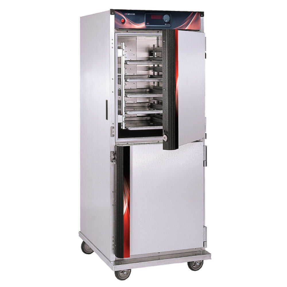 The Cres Cor H1381834D Cabinet Mobile Heated Insulated is a versatile solution for food service operations requiring an efficient way to transport and maintain the temperature of large quantities of food. This state-of-the-art cabinet features a top-mount heater assembly, which ensures consistent heating throughout. Its robust design includes a recessed push/pull handle and channel pan slides that accommodate up to 32 pans measuring 18" x 26", spaced at 1-1/2" centers. This capacity makes it ideal for catering services and large-scale food production environments. The cabinet's construction is both practical and durable, featuring aluminum on the exterior and interior, contributing to its longevity and ease of cleaning. Safety and hygiene are priorities with anti-microbial latches that help reduce contamination risks. The unit is fitted with dutch doors, enhancing access while minimizing heat loss, a crucial feature for maintaining food quality. For mobility and stability, it is equipped with four heavy-duty 5" swivel casters, two of which are braked, ensuring easy transport and secure placement during use. The Cres Cor H1381834D is a reliable, high-capacity heated cabinet that caters to the demands of professional kitchens and catering services, focusing on safety, mobility, and efficient temperature management.