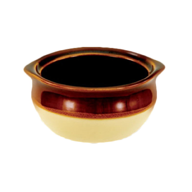 The Crestware CM4OSC Onion Soup Crock is a meticulously crafted kitchen essential with a 10 oz. capacity, designed to enhance the dining experience for various market segments. Measuring 5 inches in length, 4-3/8 inches in width, and 2-3/8 inches in height, this crock is tailored for precise serving sizes and efficient use of space in both professional and home kitchens. Its vitrified ceramic construction ensures durability and resistance to chipping, making it a long-lasting addition to any cookware collection. The crock is oven and microwave safe, allowing for versatile cooking and reheating options, catering to the needs of busy commercial kitchens and home cooks alike. Available only in full case quantities, this product is packed by 3 dozen per case, making it a practical choice for bulk purchasing by restaurants and catering services. The unique 3-tone design of the crock adds an aesthetic appeal to tabletop presentations, making it suitable for a variety of dining settings. The Crestware CM4OSC Onion Soup Crock combines functionality with style, offering a reliable and attractive solution for serving and enjoying classic onion soup and other culinary delights.