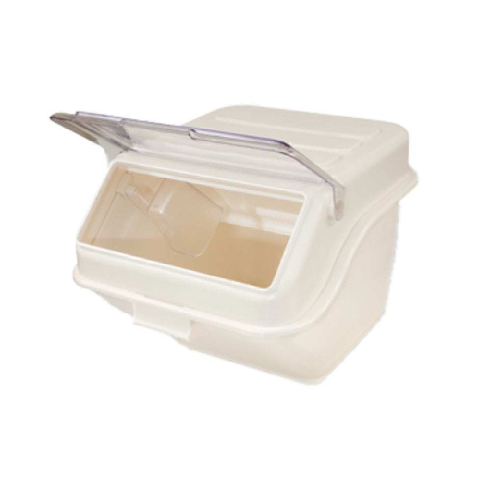 The Crestware IN10 Shelf Ingredient Bin - 10 gal with Hinged Clear Lid is a versatile storage solution designed for efficient ingredient management in various culinary environments. Featuring a generous 10-gallon capacity, this bin is ideal for storing bulk ingredients, making it a valuable asset for both commercial kitchens and home chefs who require substantial storage space. The hinged clear lid provides easy access while allowing for quick visual checks of content levels, ensuring that ingredients are always within reach and inventory is easily managed. Constructed with a durable plastic material, the white body not only offers a clean and professional look but also assures longevity and resistance to everyday wear and tear. An included scoop adds convenience, facilitating effortless portioning and minimizing cross-contamination risks. The Crestware IN10 Shelf Ingredient Bin is perfect for bakeries, restaurants, and any food service operation seeking a reliable and efficient way to store and organize dry ingredients. Its thoughtful design and robust construction underscore its unique value proposition, catering to diverse user needs with its practicality and durability in the food service industry.