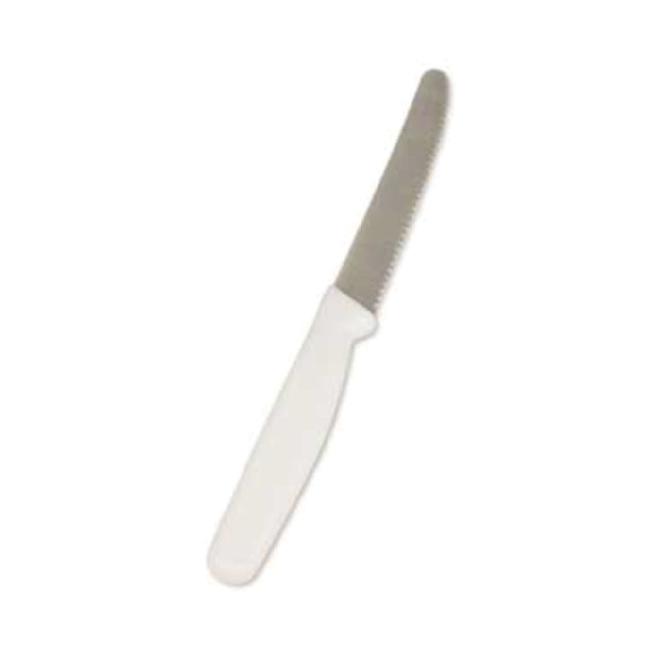 The Crestware KN06 Utility Knife is a precision tool engineered for versatility and durability, measuring 8-1/2 inches in overall length with a 4-inch serrated blade. Crafted from high carbon German steel, the blade ensures exceptional sharpness and edge retention, making it an essential instrument for various culinary applications. The robust material of the blade provides resistance to corrosion and wear, characteristics that are highly valued in professional kitchens and home cooking environments alike. The handle, made from polypropylene, offers a comfortable grip and is designed to withstand the rigors of frequent use while maintaining its structural integrity. This knife is NSF certified, highlighting its adherence to strict public health and safety guidelines, a feature that appeals to both commercial food service operations and discerning home chefs. These specifications make the Crestware KN06 Utility Knife a sought-after tool across different market segments, from restaurant professionals requiring reliable and efficient kitchen tools to home users seeking high-quality, durable culinary equipment. Its thoughtful design and superior materials underscore its position as a valuable asset in any cooking setting.