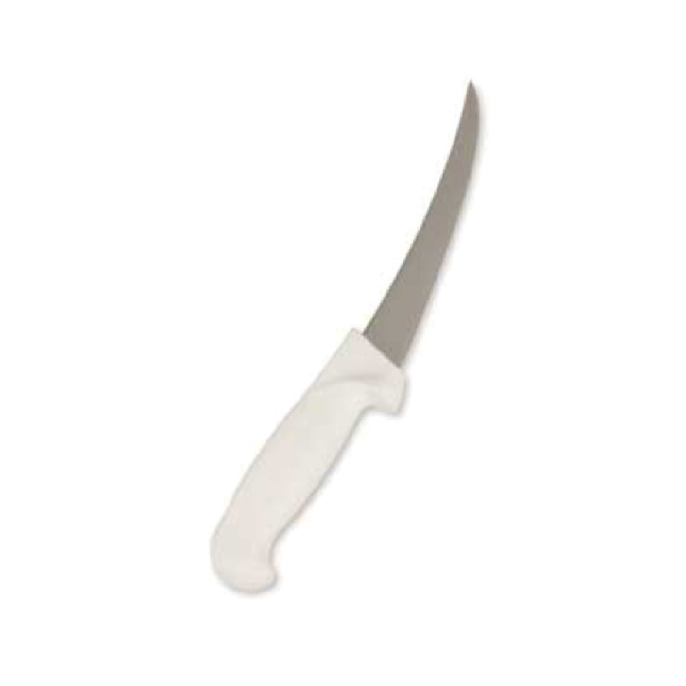 The Crestware KN41 Boning Knife 6" Curved Blade is a specialized tool designed for precision and efficiency in the kitchen. Featuring a 6-inch curved blade crafted from high-carbon German steel, this knife ensures superior durability and a sharp edge, essential for intricate boning tasks. The high-carbon content in the steel enhances its strength and resistance to wear, making it a reliable choice for professionals who demand consistent performance. The knife's polypropylene handle, finished in white, provides a comfortable and secure grip, minimizing hand fatigue during extended use. Its ergonomic design caters to both commercial kitchens and culinary enthusiasts alike, offering an excellent balance between functionality and comfort. The Crestware KN41 Boning Knife is NSF certified, signifying its adherence to public health standards, making it a trusted option in environments where food safety is paramount. Packaged in a clam pack for display, this knife also provides an attractive presentation for retail environments. The combination of its technical features and compliance with industry standards positions the Crestware KN41 Boning Knife as a valuable asset across various segments of the culinary industry, from professional chefs to home cooks looking for quality and precision in their kitchen tools.