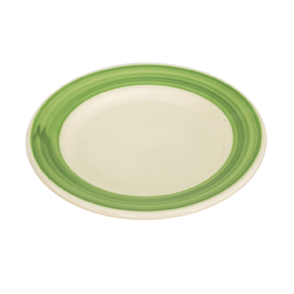 The Crestware PIC46G Plate 10-1/4" Dia. Round is a meticulously designed piece crafted to meet the diverse needs of the culinary industry. With a diameter of 10-1/4 inches, this round plate is optimal for serving a variety of dishes, boasting a rolled edge that adds both durability and a touch of elegance to its design. Made from vitrified ceramic, the plate is both oven and microwave safe, making it versatile and convenient for modern kitchen demands. Its green wide rim not only provides a distinctive aesthetic appeal but also frames the food beautifully, enhancing presentation. The Piccolo series is noted for its functionality and style, and this plate is no exception. Sold only in full case quantities, each pack contains one dozen plates, ensuring that establishments are well-stocked for service. Ideal for restaurants, catering services, or any food service operation looking to combine utility with style, the Crestware PIC46G Plate delivers both, ensuring reliability and satisfaction. Whether for day-to-day use in a bustling kitchen or for special occasions, its quality and performance are steadfast, making it an essential component of any professional kitchen's dinnerware collection.