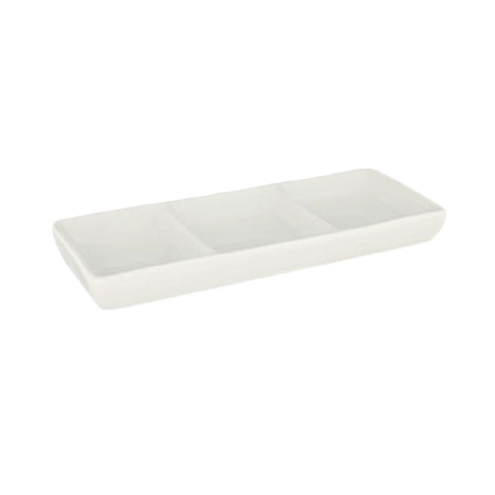 The Crestware QUA6 Dish 5-3/4" x 2-1/2" Rectangular is a sophisticated and practical addition to any culinary setting. This dish stands out with its three-compartment design, offering versatility for serving multiple items simultaneously, which is particularly beneficial in restaurant and catering environments. Crafted from fully vitrified ceramic, the dish boasts enhanced durability and resistance to chipping, making it ideal for frequent use. Its pearl white hue adds a touch of elegance, seamlessly blending into various table settings while highlighting the vibrant colors of the food served. The dish is sold only in full case quantities, with each case containing 96 pieces, catering well to large-scale operations such as hotels and banquet halls. Its practical dimensions of 5-3/4" x 2-1/2" make it suitable for serving a variety of foods, from appetizers to desserts, while the rectangular shape offers a modern aesthetic and efficient use of space. The Crestware QUA6 Dish is part of the Quattro collection, providing a cohesive and stylish option for establishments looking to maintain a consistent theme. Its combination of functionality, durability, and elegance makes it a valuable asset for any food service professional looking to enhance both presentation and practicality.