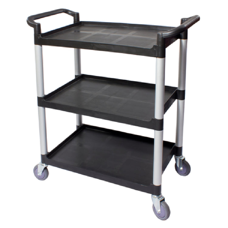 The Crestware RBTROLLEY Regular 3-Tier Cart is a practical and versatile solution for various industries, featuring dimensions of 16-1/8" x 24-1/2" x 36" H and a capacity to support up to 265 lbs. This cart is designed with three tiers, providing ample space for transporting a variety of items, making it ideal for use in restaurants, hotels, and catering services. Its construction includes two handles, which facilitate easy maneuverability and control, enhancing the user experience. Crafted from durable poly material, this cart is both sturdy and resilient, ensuring longevity even in demanding environments. The cart's black finish offers a professional and sleek appearance, suitable for any setting. Designed as a knock-down (KD) unit, it can be assembled or disassembled with ease, which is particularly beneficial for storage and transport when not in use. The Crestware RBTROLLEY Regular 3-Tier Cart combines functionality with a robust structure, catering to the needs of those seeking efficiency, durability, and reliability in their operations, making it a valuable asset across multiple service-oriented sectors.