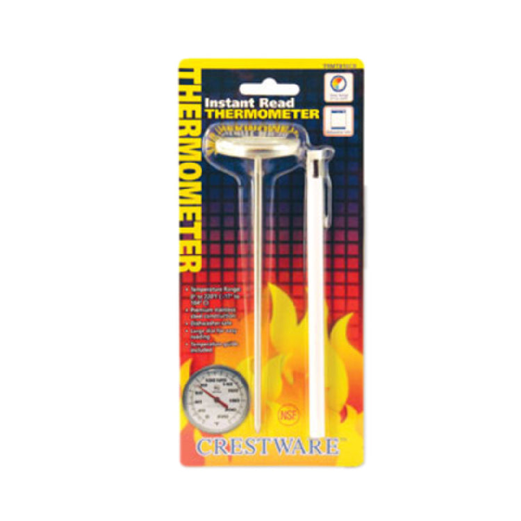 The Crestware TRMT816CB Thermometer Dial 1.6" Dia. Face is a precision instrument designed for accurate temperature measurement across a range of 0-220°F. This thermometer features a 1.6-inch diameter face, providing a clear and easy-to-read display for quick and reliable readings. Made from 18/10 stainless steel, the thermometer boasts a robust construction that ensures long-lasting durability, even in demanding environments. Its stainless steel housing not only offers strength but also enhances its resistance to corrosion, making it a reliable tool in various culinary settings. An integral sheath is included for enhanced protection and safety during storage and transport. Additionally, the Crestware TRMT816CB is dishwasher safe, providing convenience for busy kitchens by allowing for effortless cleaning and maintenance. This thermometer is ideal for chefs, bakers, and culinary professionals who require precise temperature control in their cooking processes. Its compact and efficient design ensures it fits seamlessly into diverse kitchen operations, making it an essential tool for any professional or home kitchen setting where precision and reliability are paramount.