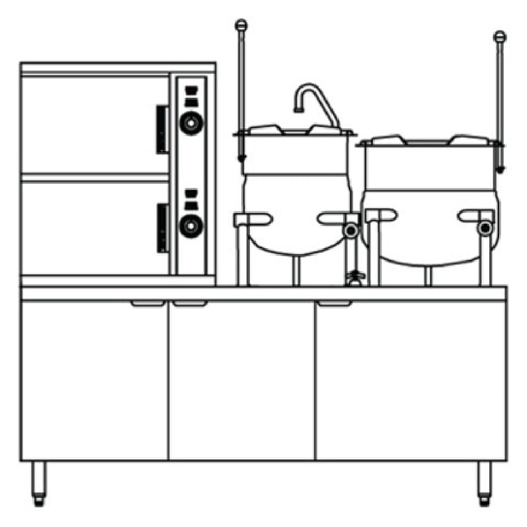 The Crown Steam ECX-10-6-10_220/60/3 Convection Steamer-Kettle Electric (2) Compartment is an advanced kitchen appliance designed for efficiency and versatility in commercial cooking environments. This electric steamer-kettle features two compartments, each tailored to specific culinary needs. It includes one 6-gallon kettle and one 10-gallon kettle, providing diverse cooking capacities. Each compartment can accommodate up to five pans measuring 12 inches by 20 inches by 2-1/2 inches, making it adaptable for various cooking volumes and styles. The unit is supported by a 60-inch cabinet base, offering a stable and robust structure. It boasts an automatic blowdown and a 60-minute timer per compartment, ensuring precision and safety in operation. The deck mount faucet valve, swing nozzle, and integral sink enhance user convenience and operational efficiency. Constructed with a 316 stainless steel interior and a 304 stainless steel exterior, the unit promises durability and long-lasting performance. The 6-inch legs with adjustable flanged feet provide stability and flexibility in installation. The inclusion of a water filter system ensures the purity of steam, while compliance with CSD-1 code package, cCSAus, and NSF standards highlights its commitment to safety and quality. This product is ideal for various market segments, including restaurants, catering services, and institutional kitchens.