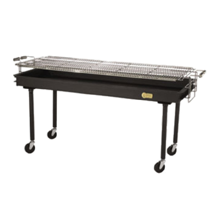 The Crown Verity CV-BM-60 Outdoor Charbroiler Charcoal 72"L x 24"D is a professional-grade charbroiler designed for outdoor culinary excellence. With dimensions of 72 inches in length and 24 inches in depth, this charbroiler features a height-adjustable grill area measuring 60 inches by 24 inches, offering ample space for a variety of cooking needs. Constructed from 14 gauge cold rolled steel, it promises durability and resilience in demanding environments. Its high heat enamel finish ensures a robust surface that withstands high temperatures while also providing an elegant appearance. The charbroiler includes a removable heavy-duty grill, simplifying cleaning and maintenance. Additionally, the unit is equipped with removable legs and 5-inch swivel casters, enhancing its mobility for versatile placement in any outdoor setting. This product is ideal for commercial kitchens, catering events, and outdoor gatherings, providing a reliable and efficient solution for charcoal grilling. The combination of its sturdy construction, adjustable grill height, and mobility features makes the Crown Verity CV-BM-60 a valuable asset for professionals seeking high-performance grilling equipment tailored for diverse culinary applications.