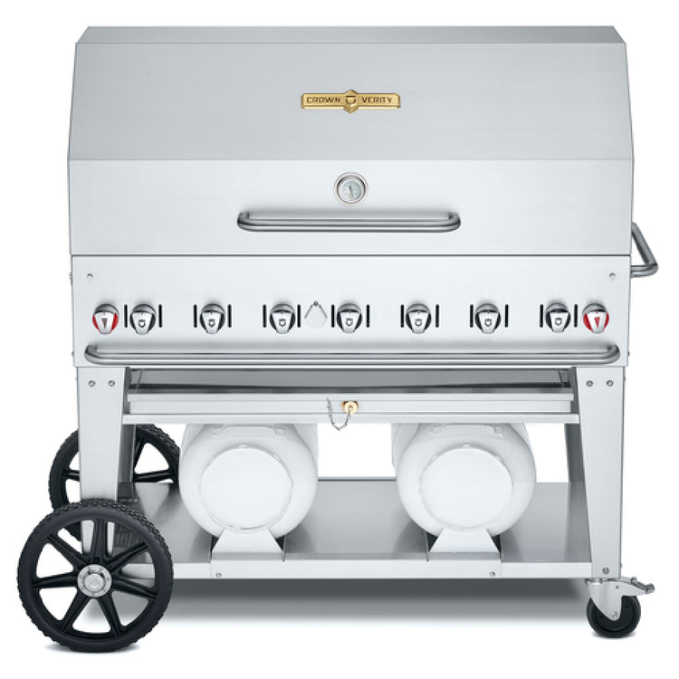 The Crown Verity CV-CCB-48RDP Club Series Grill LP Gas 56"L X 28"D is a premium grilling solution for professional and high-end amateur chefs alike, designed to deliver exceptional performance in a variety of culinary settings. This grill features a spacious 56-inch by 28-inch cooking area, supported by seven high-efficiency burners that collectively produce an impressive 99,000 BTU, ensuring even heat distribution and optimal cooking results. Constructed from durable stainless steel, the grill's robust design includes a stainless steel grill surface and radiants, enhancing its longevity and resistance to the elements. The unit comes equipped with roll domes and bun racks, providing additional functionality and convenience during use. For mobility and stability, the grill features two 14-inch wheels and two total lock casters, allowing for easy transport and secure placement. It also includes an undershelf and sturdy legs for added storage and support. The package comprises two 30 lb. horizontal propane cylinders, ensuring you have ample fuel for extended grilling sessions. Ideal for clubs, catering businesses, and upscale outdoor events, the Crown Verity CV-CCB-48RDP is engineered to meet the rigorous demands of continuous use while delivering superior grilling performance.