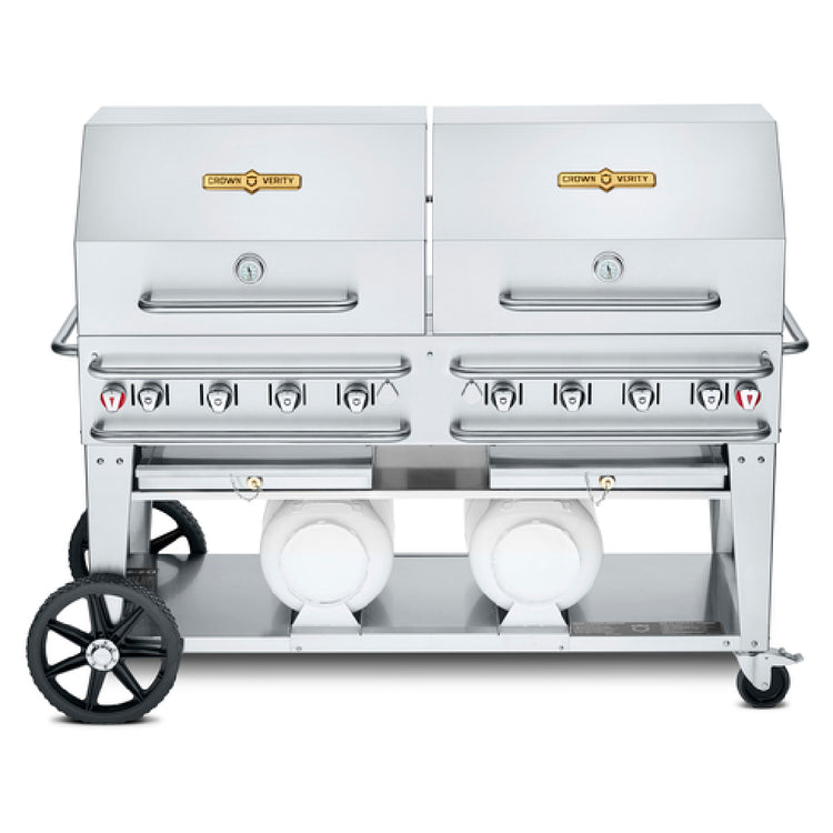 The Crown Verity CV-CCB-60RDP Club Series Grill, LP Gas, is a premium grilling unit measuring 69"L x 28"D, specifically engineered for professional culinary environments that demand high performance and reliability. This grill features eight powerful burners, all constructed from durable stainless steel, providing robust and consistent heat for any grilling task. Its stainless steel grill and radiants ensure longevity and efficient heat distribution, crucial for commercial use. The grill is equipped with practical add-ons including an undershelf and sturdy legs for enhanced stability. Two 30" roll domes are included to retain heat and deliver flawless cooking results. For convenience in outdoor settings, the grill comes with bun racks and operates on two 30 lb. horizontal propane cylinders, ensuring ample fuel availability. Mobility is effortless with two 14" wheels, complemented by two total lock casters for secure positioning during operation. Ideal for catering services, restaurants, and large-scale events, the Crown Verity CV-CCB-60RDP Club Series Grill combines versatility with robust construction, making it a valuable asset in any commercial grilling setup.