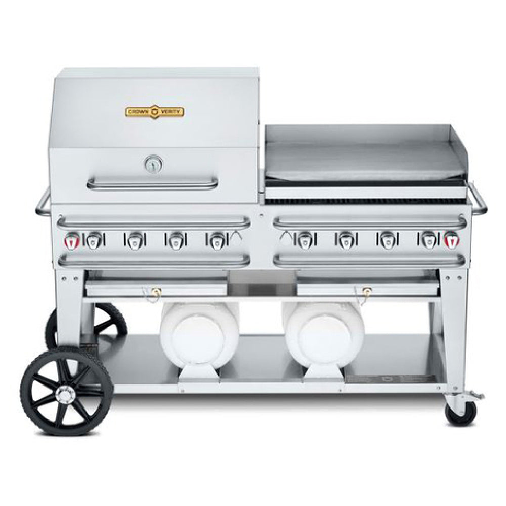 The Crown Verity CV-CCB-60RGP Club Series Grill is a high-performance LP gas grill measuring 69"L x 28"D, designed for various professional culinary environments. This grill features eight powerful burners, ensuring even heat distribution and efficient cooking, perfect for high-volume grilling operations. The construction is entirely stainless steel, providing durability and resistance to corrosion, while the stainless steel grill and radiants contribute to consistent cooking results. It includes two 30" roll domes, enhancing cooking versatility and temperature control. The grill is equipped with a Pro Griddle Package, expanding its functionality to griddle-based dishes. For convenience and mobility, it comes with two 14" wheels, and its undershelf and legs offer additional storage and stability. The unit includes two 30 lb. horizontal propane cylinders, ensuring extended cooking sessions without interruptions. The Crown Verity CV-CCB-60RGP is ideal for catering events, restaurants, and club settings, offering a combination of robust construction, versatility, and convenience. Its precise engineering and comprehensive features make it a valuable asset for professionals seeking reliability and high performance in a grill.