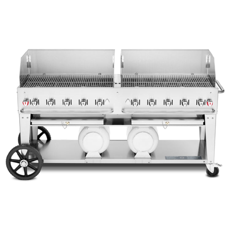 The Crown Verity CV-CCB-72WGP Club Series Grill LP Gas 81"L x 28"D is a high-performance commercial grill designed for precision cooking and durability. Featuring 10 powerful burners, this grill is engineered for optimal heat distribution, ensuring consistent cooking results across its expansive surface. Its stainless steel construction, including both the body and the grill radiants, offers exceptional resistance to corrosion and wear, making it suitable for frequent use in professional settings. The grill comes equipped with 30" wind guards, providing effective protection against wind interference, which is crucial for outdoor cooking environments. Additionally, the unit includes an undershelf and legs crafted from stainless steel, enhancing its structural integrity and offering ample storage space. The CV-CCB-72WGP is also highly mobile, featuring two 14" wheels and two total lock casters, allowing for easy relocation and secure placement. It includes two 30 lb. horizontal propane cylinders, ensuring a reliable fuel source for extended cooking sessions. This grill is perfectly suited to catering companies, event venues, and restaurants seeking a robust, mobile grilling solution that combines high capacity and durability with ease of use. Its comprehensive feature set is designed to meet the demands of professional culinary environments.