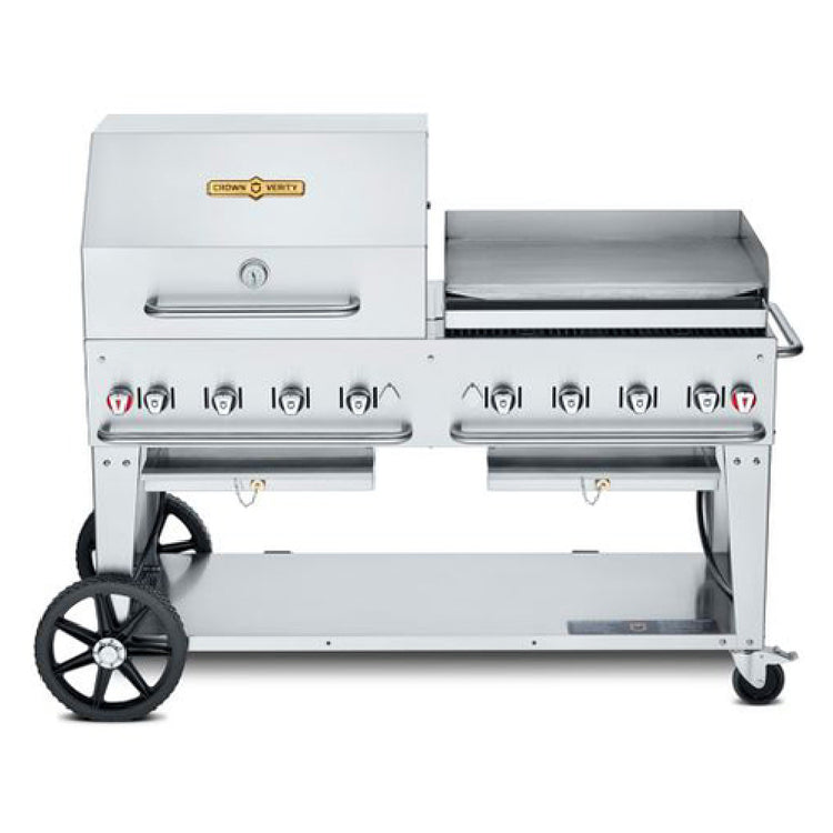 The Crown Verity CV-MCB-60-SI-BULK-RGP Mobile Outdoor Charbroiler is a high-performance cooking unit designed to meet the needs of various food service operations. This charbroiler features an expansive 58-inch by 21-inch grill area, powered by 8 burners, providing ample cooking space for large-scale grilling. It operates on LP gas and comes with a single inlet gas hose, making it compatible with 50 lb. or 100 lb. LP tanks, ensuring flexible fuel options. The inclusion of a roll dome and Pro Griddle Package enhances its functionality, allowing for versatile cooking techniques. Constructed from 304 stainless steel, this charbroiler offers exceptional durability and resistance to corrosion, making it suitable for outdoor use. The stainless steel construction extends to the grill, radiants, and lighter tube (pilot), ensuring consistent performance and longevity. A water pan is included to help maintain moisture and reduce flare-ups during grilling. This model is designed for mobility, making it an ideal choice for caterers, event organizers, and outdoor cooking enthusiasts seeking a reliable and efficient charbroiling solution. Its robust build and professional-grade capabilities position it as a valuable asset across diverse culinary settings.