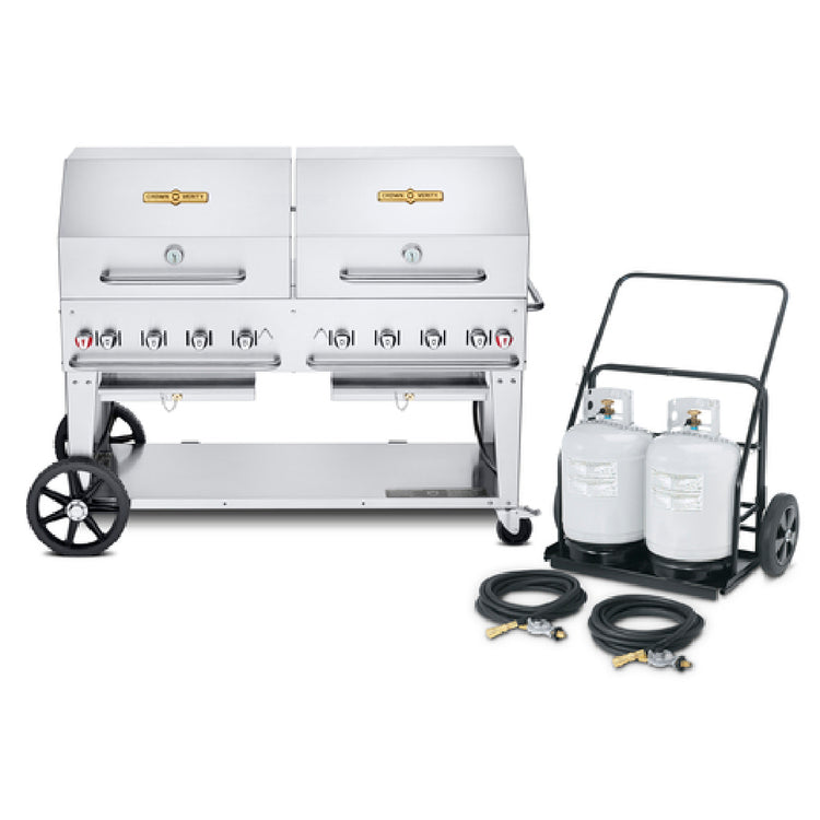 The Crown Verity CV-MCC-60RDP Club Series Mobile Cart Grill With Tank Cart LP Gas is a high-performance grilling solution tailored for commercial settings and large-scale events. This grill stands out with its expansive 58-inch by 21-inch grill area, providing ample cooking space for catering to large crowds. It features eight powerful burners, ensuring even and efficient heat distribution for consistent cooking results. Constructed from 304 stainless steel, the grill promises durability and resistance to the elements, making it suitable for both indoor and outdoor use. The stainless steel grill radiants and lighter tube (pilot) enhance heat retention and ignition reliability, while the inclusion of a water pan aids in maintaining a moist cooking environment and simplifies cleanup. The sturdy design is complemented by a practical undershelf for storage, and it is equipped with legs featuring two 14-inch wheels and two total lock casters, offering stability and mobility. The Crown Verity CV-MCC-60RDP is an ideal choice for restaurants, catering businesses, and event planners seeking a versatile and robust grilling unit that delivers exceptional performance and reliability in demanding environments.