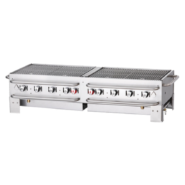 The Crown Verity CV-PCB-60 Portable Grill LP Gas 66" is a highly efficient grilling solution designed for professional outdoor cooking environments. Featuring eight robust 15,000 BTU burners, this grill delivers an impressive total heat output of 129,000 BTU, ensuring even and consistent cooking for large volumes of food. Its 66-inch width provides ample grilling space, making it suitable for catering services, large gatherings, or commercial food events. Constructed from durable stainless steel, the grill promises longevity and resilience, while the inclusion of crash bars on the front and sides enhances its durability and safety during transport and use. The grill is equipped with water pans, which are essential for reducing flare-ups and maintaining moisture in the cooking environment, thus improving the quality of the grilled food. The quick disconnect and regulator feature allows for a swift and secure connection to the LP gas source, catering to efficient and safe operation. Furthermore, the grill's design includes stacks for easy storage, optimizing space when not in use. Certified by NSF, cETLus, and ETL-Sanitation, it conforms to the highest safety and sanitation standards, making it a reliable choice for both commercial and high-end residential grilling applications.