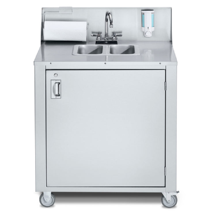 The Crown Verity CV-PHS-2C Portable Sink is a specialized unit designed for cold water usage, featuring dual bowls each measuring 6 inches wide by 12 inches front-to-back and 5 inches deep. This portable sink is ideally suited for various segments within the food service and hospitality industries, where mobility and convenience are paramount. It includes two 5-gallon removable fresh water tanks and two 7-1/2 gallon removable waste water tanks, ensuring ample capacity for extended use without constant refilling or emptying. The unit is equipped with both soap and paper towel dispensers, adding to its utility in maintaining hygiene standards. The Crown Verity CV-PHS-2C utilizes an electric water pump alongside a hands-free foot pump operation, providing flexibility and ease of use in different operational settings. This combination of specifications makes it an invaluable asset for events, outdoor catering, or any scenario where traditional plumbing is unavailable. Its portability and functional design cater to the needs of professional kitchens and service environments, ensuring that hygiene and efficiency are upheld in challenging and dynamic workspaces.