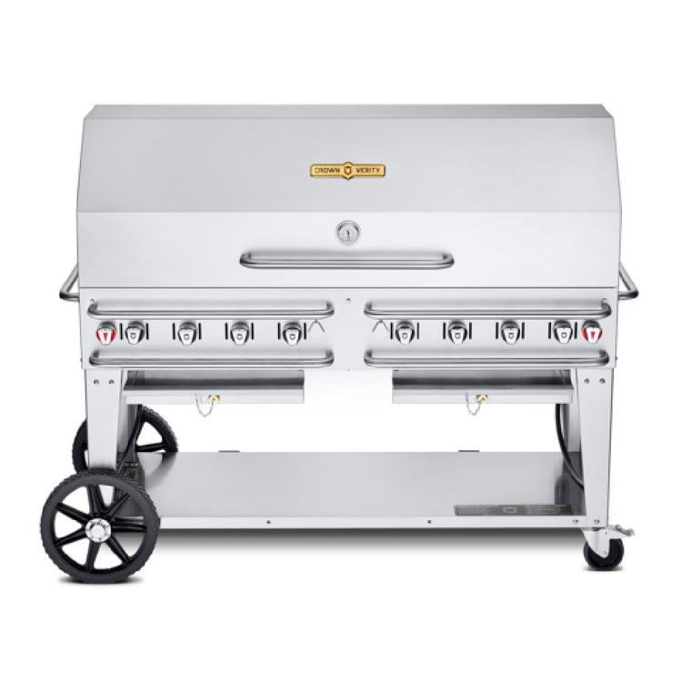 The Crown Verity CV-RCB-60-1RDP Pro Series Grill LP Gas 69"L x 28"D is a premium outdoor cooking solution designed for professional chefs and serious grill enthusiasts. This grill boasts eight powerful burners, offering high performance and even heat distribution for perfect grilling results. Its construction features robust stainless steel, ensuring durability and resistance to the elements, making it ideal for outdoor use. The 60-inch roll dome included with the grill provides excellent heat retention and cooking flexibility, while the bun racks add convenience for warming bread and buns. The grill's undershelf offers additional storage space, enhancing organizational efficiency during cooking sessions. Equipped with two 14-inch wheels and two total lock casters, the grill is easily maneuverable yet stable when in use. The integration of stainless steel radiants ensures consistent temperature control, which is critical for achieving perfectly cooked meals. The Crown Verity CV-RCB-60-1RDP is a versatile and reliable choice for catering operations, event venues, and high-capacity outdoor cooking environments, delivering exceptional grilling performance and long-lasting quality. Its thoughtful design and advanced features make it a standout choice for professionals who demand excellence in their culinary equipment.