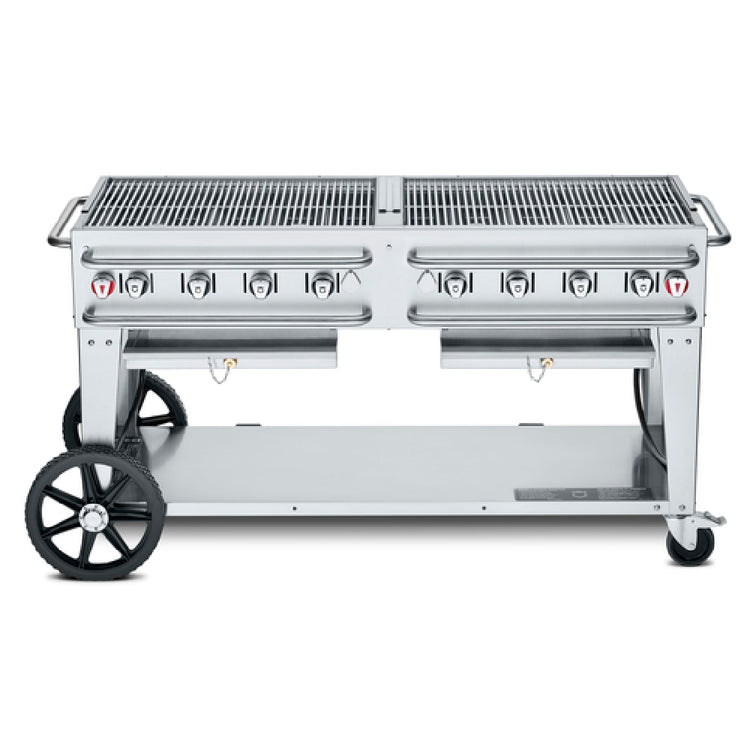 The Crown Verity CV-RCB-60 Pro Series Grill LP Gas 69"L x 28"D is a versatile and robust cooking solution tailored for professional chefs and commercial kitchens seeking high performance and reliability. This grill boasts 8 burners, providing ample cooking power for large-scale events or bustling kitchen environments. Constructed from durable stainless steel, both the grill and its radiants are designed to withstand rigorous use while maintaining a sleek, professional appearance. Equipped with an undershelf and sturdy legs, it offers additional storage space and stability during operation. The inclusion of (2) 14" wheels and (2) total lock casters ensures easy mobility and secure placement, making it adaptable to various kitchen layouts. Enhanced safety features include crash bars located above and below control knobs, as well as on each end of the unit, offering added protection during use. This grill is an ideal investment for catering services, restaurants, and hospitality venues looking to elevate their grilling capabilities with a reliable, high-capacity unit. Its thoughtful engineering and design reflect Crown Verity's commitment to quality and efficiency, making it a standout choice for industry professionals.