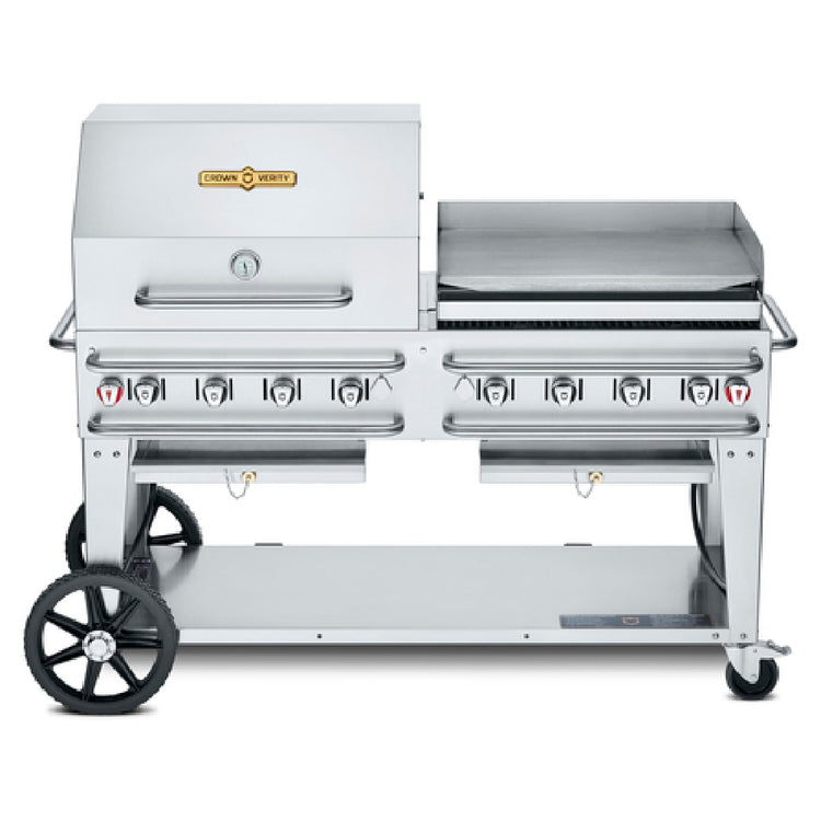 The Crown Verity CV-RCB-60RGP Pro Series Grill is a high-performance LP gas grill measuring 69 inches in length and 28 inches in depth, designed specifically for the demanding needs of professional chefs and caterers. This grill boasts eight powerful burners, ensuring even and efficient cooking across its expansive surface. Its robust stainless steel construction offers durability and longevity, making it a reliable choice for heavy-duty use. The addition of a roll dome enhances cooking versatility, allowing for even heat distribution and improved flavor retention. Complementing the grill's functionality is the Pro Griddle Package, providing chefs with the flexibility to prepare a wide range of dishes. The grill features stainless steel radiants, which optimize heat transfer, ensuring consistent cooking results. For added convenience, it includes an undershelf for storage and sturdy stainless steel legs for stability. Mobility is facilitated by two 14-inch wheels and two total lock casters, allowing for easy transportation and secure placement. Essential crash bars above and below the control panel add an extra layer of protection, making this grill a top choice for professionals seeking efficiency, durability, and versatility in their cooking equipment.