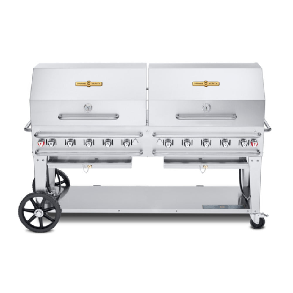 The Crown Verity CV-RCB-72RDP-SI50/100 Pro Series Grill - LP Gas - 81"L x 28"D is a high-performance grilling solution designed for professional culinary environments. Featuring a substantial 81-inch length and 28-inch depth, this grill is equipped with 10 powerful burners, ensuring even heat distribution and efficient cooking. It includes a single inlet system, complemented by a 1/2 inch gas hose and regulator assembly for seamless connection to either 50 lb. or 100 lb. LP tanks, although the tanks are not included. The grill's stainless steel construction enhances durability and resistance to corrosion, making it a reliable choice for heavy-duty use. It comes with two roll domes and bun racks, providing versatility for various grilling tasks. The inclusion of stainless steel radiants, undershelf, and legs further contributes to the grill's robust design. For mobility and stability, the grill is fitted with two 14-inch wheels and two total lock casters, allowing for easy transportation and secure placement. The Crown Verity CV-RCB-72RDP-SI50/100 Pro Series Grill is an exceptional choice for catering services, restaurants, and food festivals, offering unparalleled grilling performance and adaptability across diverse market segments within the industry.