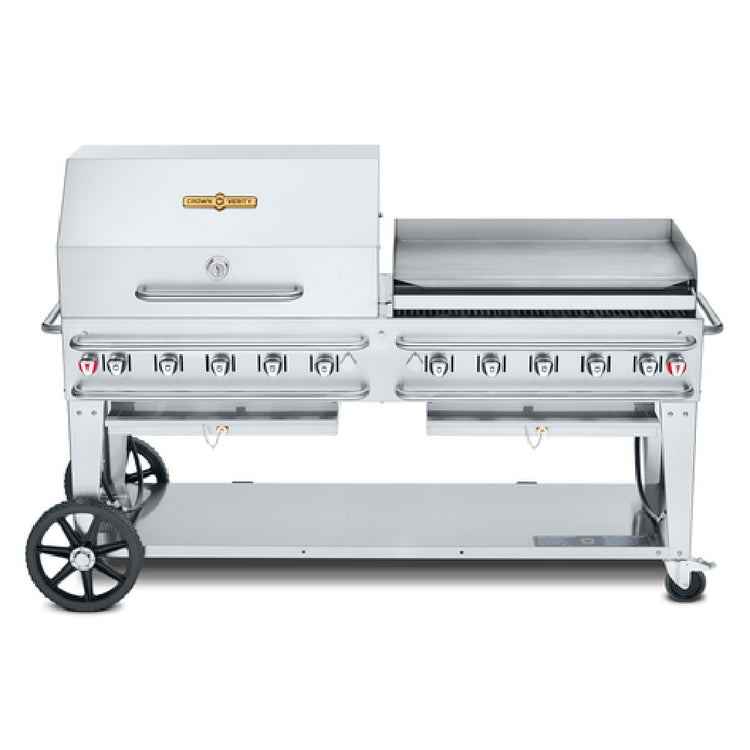 The Crown Verity CV-RCB-72RGP-SI-BULK Pro Series Grill is a professional-grade outdoor cooking appliance, featuring a substantial 81-inch length by 28-inch depth, making it a formidable choice for catering services and high-volume food operations. This grill is powered by LP gas and is equipped with 10 high-performance burners, providing the precision and heat distribution needed for a variety of cooking applications. With a single inlet gas hose included, it is compatible with 50 lb. or 100 lb. LP tanks, ensuring flexibility and extended use over long periods. The Pro Griddle Package and roll dome enhance its versatility, allowing users to expand their culinary offerings. Constructed from durable stainless steel, it includes stainless steel grills, radiants, undershelf, and legs, ensuring long-term resilience and ease of maintenance. The grill's mobility is facilitated by (2) 14-inch wheels and (2) total lock casters, making it easy to reposition as needed. This robust construction and thoughtful design make the Crown Verity CV-RCB-72RGP-SI-BULK Pro Series Grill an ideal choice for a variety of markets, including food service establishments, outdoor event caterers, and professional chefs who require reliable and efficient equipment.