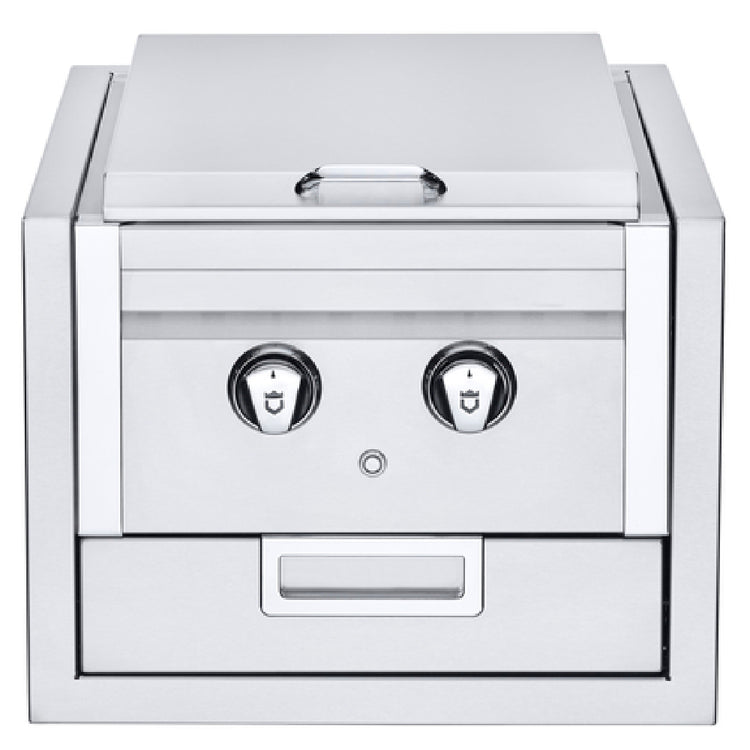 The Crown Verity IBISB Infinite Series Built-In Dual Side Burner is expertly designed for discerning culinary professionals and outdoor kitchen enthusiasts. This model features dual burners, each with a powerful output of 15,000 BTUs, offering robust cooking performance for a variety of outdoor cooking needs. The burners are crafted for integration into a built-in outdoor kitchen setup, providing versatility and high cooking efficiency in a compact form. Accompanied by a stainless steel cover, this side burner ensures durability and longevity, protecting the burners when not in use and maintaining a sleek appearance. The design focuses on maximizing functionality while offering an elegant addition to any outdoor kitchen space. Whether catering to the needs of a bustling commercial kitchen or enhancing a home chef's backyard setup, the Crown Verity IBISB seamlessly combines power with premium construction. It's an ideal choice for those seeking a high-quality, reliable side burner solution that meets diverse cooking demands while maintaining the aesthetic and functional standards expected in professional-grade outdoor cooking environments.