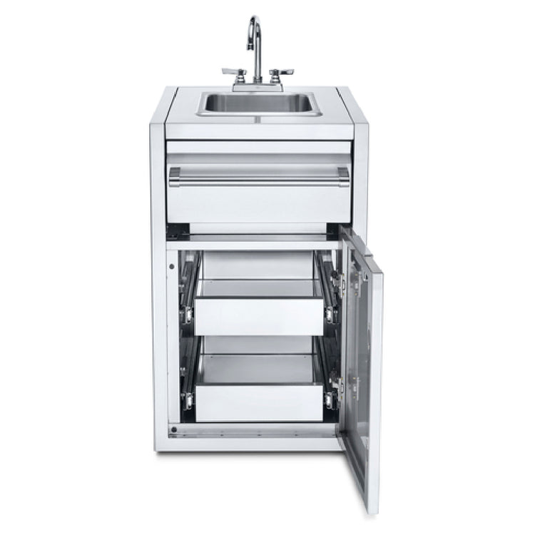 The Crown Verity IBISC-SK-2D Small Built-In Cabinet With Sink & (2) Drawers is a compact and functional addition to any kitchen or outdoor grilling area. This versatile unit features a built-in sink, providing convenient access to water for washing and cooking tasks. The cabinet includes two drawers, offering ample space for storing utensils, cooking tools, or small kitchen appliances, making organization effortless. A built-in paper towel holder ensures that cleaning supplies are always within reach, enhancing the efficiency of your workspace. The storage cabinet below provides additional room for larger items or cleaning supplies, making it a practical solution for both residential and commercial settings. The space-saving design of the IBISC-SK-2D makes it ideal for smaller kitchens or outdoor spaces where maximizing functionality without sacrificing valuable space is essential. Crafted with attention to detail and quality, this unit is perfect for homeowners, chefs, and catering professionals seeking a reliable and efficient storage solution. Its built-in features and compact size make it an ideal choice for those looking to optimize their kitchen setup, whether for everyday use or special event catering. Experience the blend of practicality and style with this small built-in cabinet tailored to meet diverse market needs within the culinary industry.