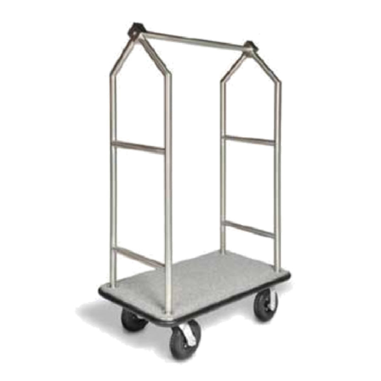 Central Specialties Ltd., 2699BK-010-GRY, Bellman's Cart, 44"W x 24"D x 71"H, angled top style, 1-1/2" tubular stainless steel frame, hanger bar, gray carpeted deck, black wrap-around bumper, heavy duty, 8" black pneumatic casters (ships in 2 cartons) (Packed By: 1 Each)