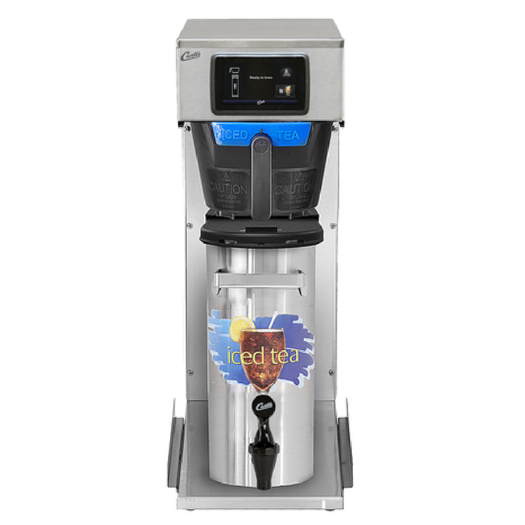 The Curtis G4TBS G4 Tea Brewer Low Profile is a versatile and efficient solution designed to cater to a range of tea brewing needs with a capacity to brew between 1-1/2 to 3-1/2 gallons. Engineered for high-demand environments, this brewer can produce up to 12 gallons per hour, supported by a 1.6-gallon tank volume. The digital touch screen facilitates user-friendly operation, enhanced by an icon-driven interface for seamless navigation. It incorporates a fast brew option and a cold brew lock out feature, allowing for diverse brewing techniques while ensuring safety and precision. The built-in self-diagnostic system assists in maintaining optimal performance. This brewer offers adjustable settings, including volume, time, and temperature, to customize the brewing process to your specific needs. The Curtis G4TBS is powered by a 1650-watt, 120v/50/60/1-ph electrical configuration, drawing 13.8 amps. It includes a cord and plug, operating efficiently at water pressures between 20-90 psi and a flow rate of 1 GPM with a 1/4" flare fitting. Optimized for various market segments, this tea brewer is ideal for cafes, restaurants, and catering services where versatility and reliability are paramount. Please note that the dispenser is not included.