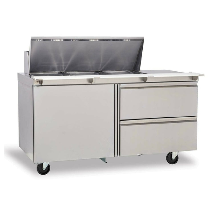 The Delfield 4460NP-18M_115/60/1 Mega Top Sandwich/Salad Refrigerator Two-section is a versatile refrigeration unit designed for commercial kitchens, featuring a width of 60 inches and a spacious capacity of 20.20 cubic feet. This two-section refrigerator includes two doors and accommodates two 1/1 GN shelves, providing ample storage for a variety of ingredients. The stainless steel top is equipped with a polyethylene cutting board and holds eighteen 1/6 size plastic pans, making it ideal for sandwich and salad preparation. The durable stainless steel front and sides, combined with ABS interior sides, ensure long-lasting performance and easy cleaning. The refrigerator is mounted on 5-inch casters for mobility and features a front-breathing rear-mounted refrigeration system with R290 Hydrocarbon refrigerant, ensuring efficient cooling while being environmentally friendly. With a horsepower of 0.35, this unit is cUL, UL, and NSF certified, meeting high standards for safety and performance. The Delfield 4460NP-18M_115/60/1 is a reliable and practical choice for delis, restaurants, and catering businesses seeking efficient refrigeration solutions tailored to their specific needs in sandwich and salad preparation.