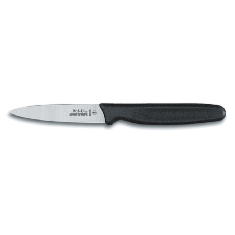 The Dexter Russell 30500 Val-U™ (30500) Paring Knife is an expertly crafted tool designed for precision and durability, featuring a 3-1/2-inch blade that has been expertly stamped for efficiency and accuracy. Constructed from DEXSTEEL™ high carbon steel, this paring knife is both stain-free and resistant to wear, ensuring longevity and reliability in any culinary setting. The straight edge of the blade is ideal for tasks requiring meticulous cutting and peeling, making it a versatile choice for professional chefs and home cooks alike. Its handle, made from black polypropylene, offers a comfortable and secure grip, further enhanced by a finger guard for added safety during use. Certified by the National Sanitation Foundation (NSF), this knife meets stringent public health standards, making it a suitable choice for commercial kitchens that prioritize hygiene and safety. Whether utilized in restaurants, catering services, or home kitchens, the Dexter Russell Val-U™ Paring Knife combines functional design with quality materials, making it an indispensable tool in any culinary environment.