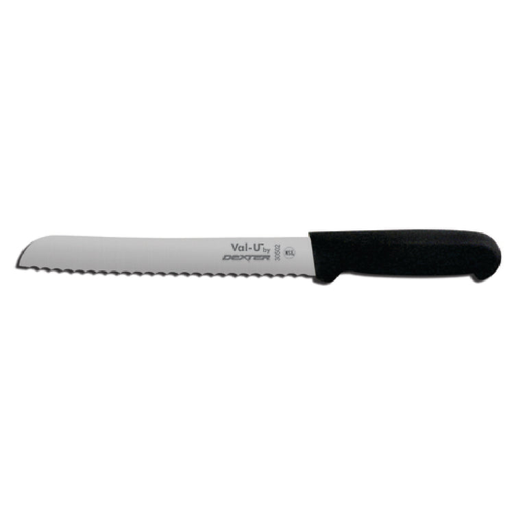 The Dexter Russell 30502 Val-U™ (30502) Bread Knife is engineered for precision and efficiency, making it ideal for various segments of the food industry from home kitchens to professional bakeries. Featuring an 8-inch stamped blade, this knife is crafted from DEXSTEEL™ stain-free, high carbon steel, ensuring long-lasting sharpness and resilience. The scalloped edge is designed specifically to slice through bread with minimal effort and maximum control, preserving the integrity of even the softest loaves. A notable feature is the inclusion of a finger guard on the handle, enhancing safety and reducing the risk of accidents during use. The black polypropylene handle is not only durable but also provides a comfortable, ergonomic grip, allowing for extended periods of use without discomfort. This knife is NSF certified, underscoring its adherence to rigorous health and safety standards, making it a trusted choice for culinary professionals. Whether for a bustling restaurant kitchen or a cozy home setting, the Dexter Russell 30502 Val-U™ Bread Knife offers a reliable and effective solution for those seeking a high-quality bread cutting tool that combines safety, functionality, and durability.