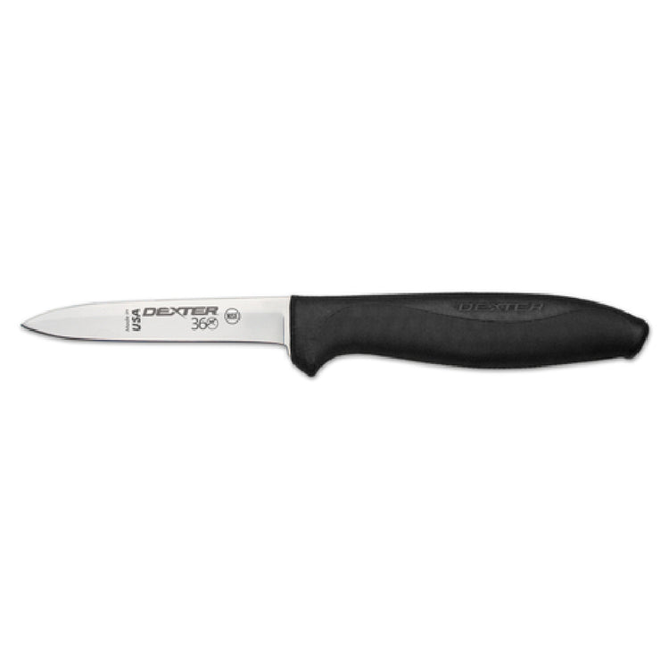 Dexter Russell, 36000, Dexter® 360™ (S360-3½-PCP) Paring Knife, 3½", spear point, straight edge, stamped, DEXSTEEL™ stain free, high carbon steel, polypropylene/Santoprene® handle, black, NSF