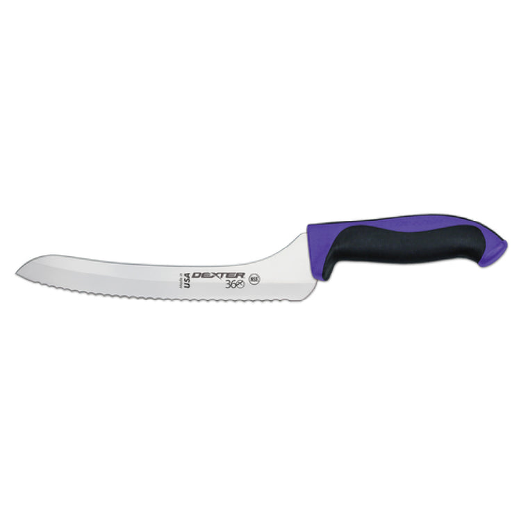 Dexter Russell, 36008P, Dexter® 360™ (S360-9SCP-PCP) Slicer, 9", stamped, scalloped edge, offset, DEXSTEEL™ stain free, high carbon steel, polypropylene/Santoprene® handle, purple, NSF