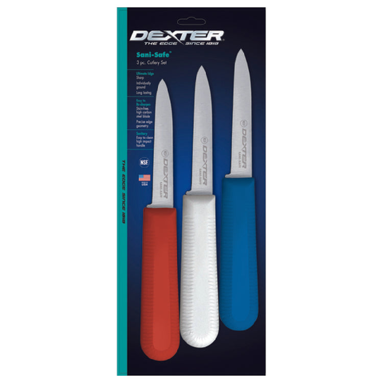 The Dexter Russell S104-3RWC Sani-Safe® (15493) Cook's Style Paring Knife 3-1/4" Stain-free is a prime tool for culinary professionals and home cooks alike, manufactured in the USA with a focus on durability and functionality. The blade, measuring 3-1/4 inches, is constructed from high-carbon steel, ensuring a stain-free cutting experience—a crucial feature for maintaining a clean and efficient kitchen environment. The knife is designed with a non-slip, textured handle, providing a secure grip even in wet conditions, which is essential for precision and safety in fast-paced cooking settings. Available with red, white, and blue handles, these knives add a touch of customization and convenience for various kitchen applications. Each pack includes three knives, making it a versatile choice for commercial kitchens or personal culinary endeavors. The NSF Certification attests to its compliance with rigorous safety and quality standards, and the Sani-Safe® technology further enhances its appeal by promoting hygiene. This knife serves as a reliable companion in food preparation tasks, offering unmatched quality and performance across different market segments, from bustling restaurant kitchens to home cooking enthusiasts seeking professional-grade tools.