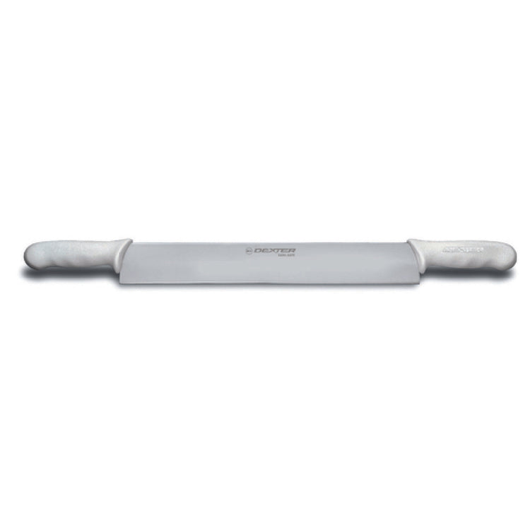 The Dexter Russell S118-14DH Sani-Safe® (9223) Cheese Knife 14" is a precision-crafted tool designed for both functionality and safety in culinary environments. This cheese knife features a 14-inch stain-free, high-carbon steel blade, providing durability and resistance to corrosion, ensuring long-lasting sharpness and performance. The double-handled design enhances control and stability, making it particularly effective for cutting through large wheels of cheese or other sizable culinary applications. Its non-slip, textured polypropylene white handles are engineered to offer a secure grip, even in slippery conditions, prioritizing user safety and comfort. This knife is NSF Certified, acknowledging its compliance with strict public health and safety standards, and is proudly made in the USA, which underscores its quality craftsmanship. The Dexter Russell Sani-Safe® Cheese Knife is uniquely suited for professional chefs, gourmet cheese shops, and large-scale catering services that demand precision and reliability. Its specialized design and robust construction make it a valuable addition to any professional kitchen, providing exceptional utility and performance in cheese preparation and beyond.