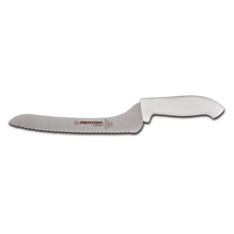 The Dexter Russell SG163-9SC-PCP SofGrip™ (24423) Sandwich Knife 9" Offset is a specialized kitchen tool, expertly engineered for both professional and home use, where precision and comfort are paramount. This knife features a scalloped edge, expertly crafted from stain-free, high-carbon steel, which ensures durability and optimal performance in cutting sandwiches with ease. The 9-inch blade is offset, which enhances user comfort and precision during cutting tasks, reducing the risk of knuckle contact with cutting surfaces. The knife's non-slip, soft rubber grip handle is designed to provide superior control and comfort, minimizing hand fatigue during extended use. This handle's white color adds a clean, professional aesthetic to any kitchen setting. The Perfect Cutlery Packaging ensures the knife is securely contained and protected during transit. NSF Certification signifies that this knife meets rigorous public health standards and safety regulations, making it a reliable choice for commercial kitchens. Proudly made in the USA, the Dexter Russell SG163-9SC-PCP SofGrip™ Sandwich Knife combines American craftsmanship with innovative design, suited for chefs, catering services, and culinary enthusiasts seeking quality cutlery solutions.