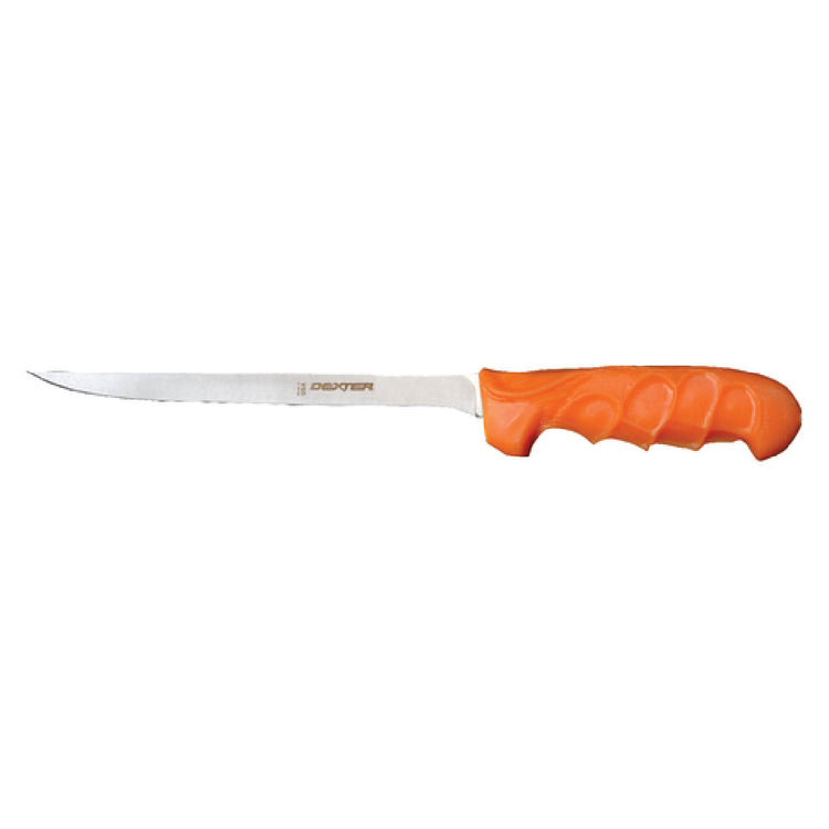 The Dexter Russell UC133-8PCP UR-Cut™ (25423) Filet Knife 8" Flexible is a precision tool designed for culinary professionals and avid home cooks alike. This 8-inch filet knife features a flexible blade crafted from DEXSTEEL™ high-carbon steel, providing stain-free performance and exceptional durability. The high-carbon content ensures a sharp edge for precise cuts, essential for filleting delicate fish or preparing meats with precision. A standout feature is its rubber moldable handle, which allows users to customize the grip to their hand shape, enhancing comfort and control during prolonged use. The handle is orange, making it easily identifiable in busy kitchen environments. As an NSF Certified product, it adheres to strict public health and safety standards, assuring users of its quality and reliability in professional settings. Proudly made in the USA, this filet knife embodies a commitment to quality craftsmanship. Its flexibility and ergonomic design cater to the needs of various segment markets, including commercial kitchens, catering services, and home cooking enthusiasts. The Dexter Russell UC133-8PCP UR-Cut™ Filet Knife 8" Flexible combines innovation and tradition, making it a valuable addition to any kitchen setup focused on efficiency and precision.
