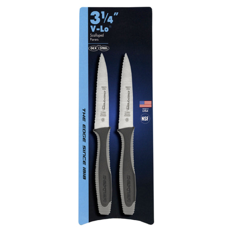 The Dexter Russell V105SC-2PCP V-Lo® (29493) Paring Knife 3-1/2" Scalloped Edge is designed for precision and durability, crafted with DEXSTEEL™ stain-free high-carbon steel. This paring knife features a 3-1/2 inch scalloped edge, ideal for intricate cutting tasks in both professional kitchens and home settings. Its soft-to-the-touch handle ensures a comfortable grip, enhancing control and reducing fatigue during extended use. This model is packaged in Clam Packaging, preserving its quality until it reaches the user. Certified by NSF, the Dexter Russell V105SC-2PCP adheres to high standards of public health and safety. Proudly made in the USA, this knife comes in a pack of two, making it a practical choice for culinary professionals and cooking enthusiasts alike. The combination of high-carbon steel and ergonomic design makes it an invaluable tool for various market segments within the food industry, offering durability, precision, and comfort as key features. Whether used in a bustling restaurant kitchen or a home environment, the Dexter Russell V-Lo® Paring Knife is engineered to deliver reliable performance and long-lasting sharpness.