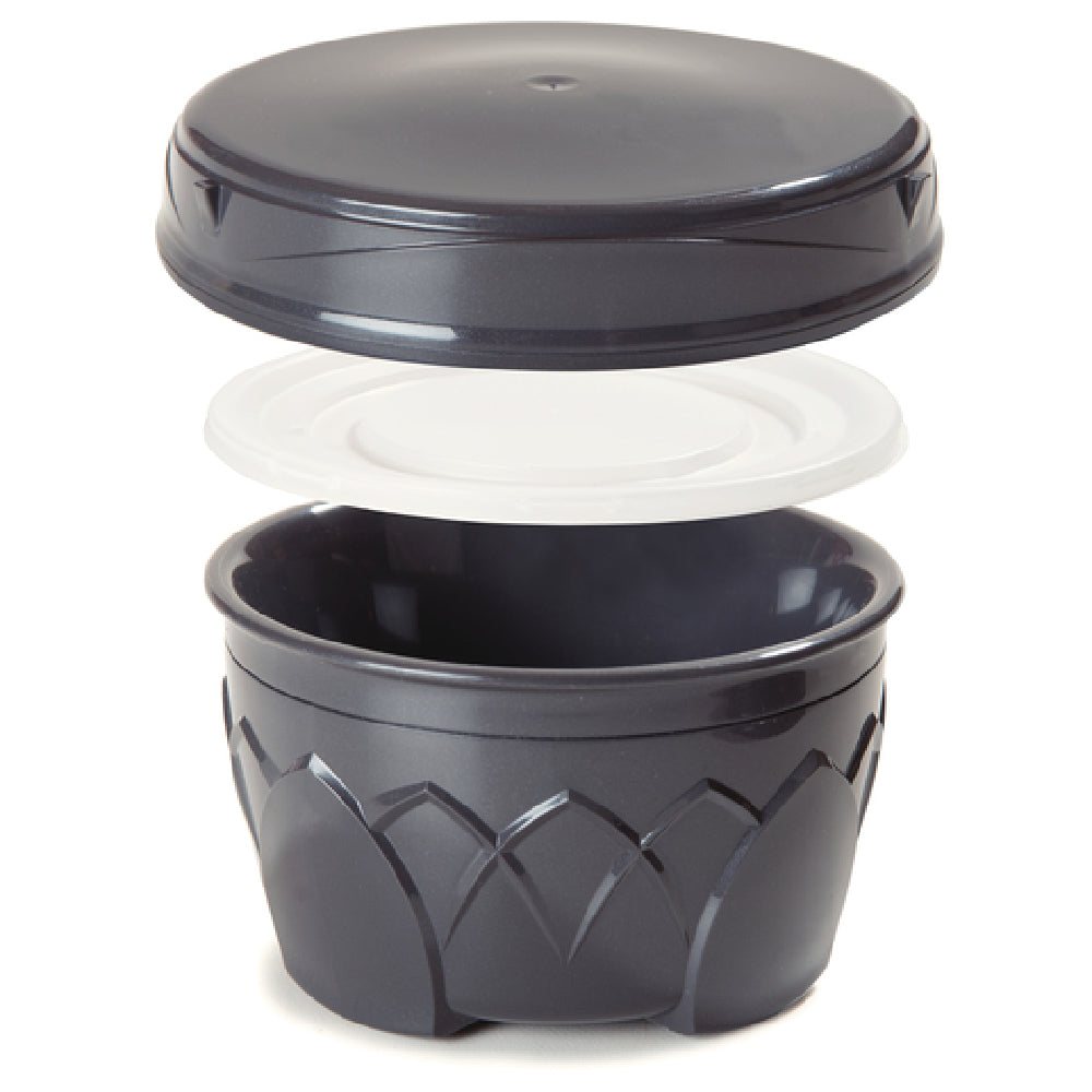 The Dinex DX3353IL44 DuraTherm™ Soup Bowl Lid is a specialized product designed for use with disposable lid round bowls, offering a practical solution for maintaining soup temperatures effectively. This insulated lid is crafted from durable polypropylene, ensuring it is lightweight yet robust, suitable for various dining settings such as hospitals, cafeterias, and other food service environments. The lid's insulation capability allows it to hold temperatures over 140°F for up to 75 minutes, making it an ideal choice for establishments that prioritize keeping food warm for extended periods. Available in graphite gray, this lid not only provides a sleek aesthetic but also complements a wide range of tableware. Packaged with 48 lids per case, it offers convenience and efficiency for high-volume operations. The Dinex DX3353IL44 DuraTherm™ Soup Bowl Lid stands out in the market for its functionality and practicality, designed specifically to meet the demands of maintaining optimal soup serving temperatures while ensuring ease of use and compatibility with disposable lids. This product is an essential component for any food service provider seeking to enhance their service quality and customer satisfaction through superior temperature retention and durable construction.