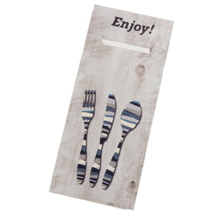 Dinex DXCTCADS1041 Cutlery Caddy Paper Sleeve Pre-loaded With 2-ply 13" X 13" Napkin is a versatile product designed for efficiency and convenience in food service settings. This innovative cutlery caddy comes with a pre-loaded 2-ply 13" x 13" napkin, making it an ideal choice for establishments looking to streamline their table-setting process. The paper sleeve provides a compact and hygienic way to present utensils, whether stainless or plastic, enhancing both the aesthetic and functional aspects of dining. The woodgrain design labeled "Enjoy" adds a touch of elegance, making it suitable for a variety of dining environments, from casual eateries to upscale venues. Supplied in a pack of 520, this product ensures ample supply for busy restaurants, catering services, or event venues, minimizing the need for constant restocking and reducing operational downtime. With its thoughtful design and practical features, the Dinex DXCTCADS1041 Cutlery Caddy is an excellent solution for enhancing dining efficiency while maintaining a high standard of presentation.