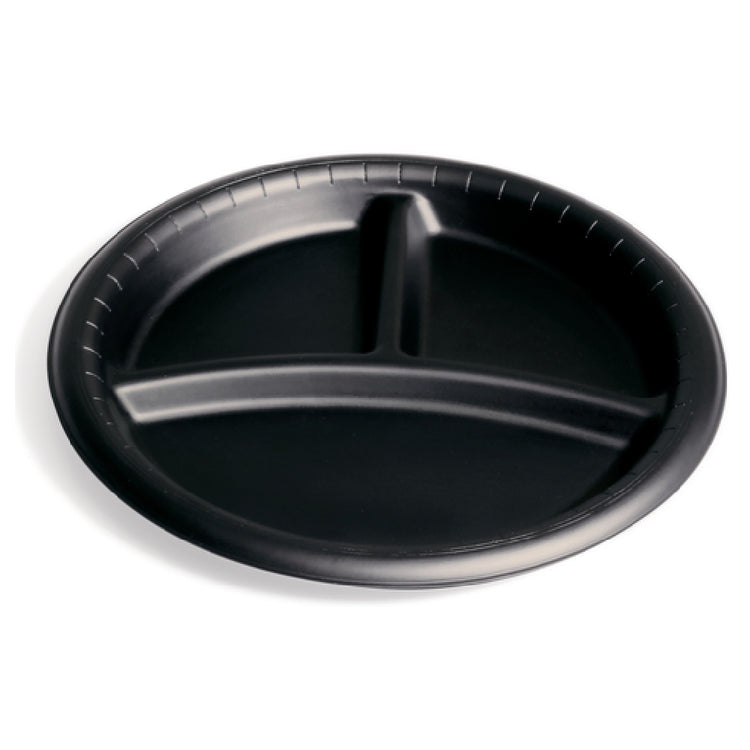Dinex DXHHPL93C03 Disposable Plate, 9" Dia., Round is a versatile product featuring a 3-compartment design that caters to diverse dining needs, making it suitable for various market segments including caterers, food service providers, and institutions. Manufactured from high-quality polypropylene, this plate is uniquely high heat safe, ensuring that it retains its shape and integrity under hot conditions, making it ideal for serving hot meals. The recyclable nature of the plate aligns with environmentally conscious practices, appealing to those focused on sustainability. Made in the USA, this product exemplifies American manufacturing standards. The plate comes in an elegant black color, complimenting various dining settings and presentations. Sold in cases of 500, it offers bulk convenience for high-volume users, ensuring consistent supply and cost-effectiveness. The 9-inch diameter provides ample space for portion control and food separation within its compartments, enhancing the dining experience by preventing cross-contamination of flavors. These features collectively establish the Dinex DXHHPL93C03 as a reliable and efficient choice for professionals seeking durable and functional disposable dining solutions.