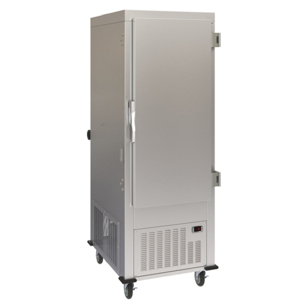 The Dinex DXPACR15R ACR Air Curtain Refrigerator is a state-of-the-art refrigeration unit designed for efficiency and versatility in commercial kitchens. This one-section refrigerator utilizes both horizontal and vertical air flow systems, enhancing its cooling capabilities for optimal temperature maintenance. The bottom-mounted self-contained refrigeration unit is capable of accommodating either fifteen 18" x 26" trays or thirty 14" x 18" trays, making it adaptable for various food storage needs. Constructed with stainless steel tray slides, it ensures durability and easy maintenance. The refrigerator features a 270-degree swing right hinged insulated stainless steel door with a reverse feature, enhancing accessibility and convenience. A rear-mounted tubular push handle with a donut bumper, combined with non-marking corner bumpers, provides ease of mobility and protection in bustling kitchen environments. Equipped with four 5" casters with brakes, it offers stability and easy maneuverability. The unit runs on a 1/2 HP motor with 120v/60/1-ph power and 16 amps, and is fitted with a NEMA-5-20P plug. Proudly made in the USA, the Dinex DXPACR15R is an essential asset for food service operations seeking a reliable, flexible, and efficient refrigeration solution.