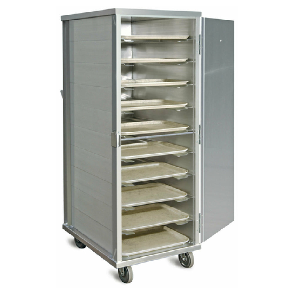 The Dinex DXPAL2T1DPT10 Tray Delivery Cart is a versatile solution designed for efficient food service delivery across various industry segments. Measuring 24-1/4" x 32-5/8" x 37-5/8"H, this pass-through cart features a single 270-degree swinging door, facilitating easy access from either side. It boasts a one-compartment design with a capacity to hold either 10 trays or 5 pans, accommodating multiple tray sizes, including 14" x 18", 15" x 20", 18" x 26", and 12" x 20". The fixed tray slides are spaced at 6" intervals, allowing for the placement of two trays per slide. Constructed with a solid .125" aluminum base, the cart is equipped with a drain, rolled edge, and fully welded corners ensuring durability and ease of cleaning. Mobility is enhanced by four 5" swivel casters—two of which have brakes—and Delrin bearings, each capable of supporting 350 lbs. A positive gravity latch secures the contents during transport. The aluminum construction underscores its durability and lightweight design. Proudly made in the USA, the Dinex DXPAL2T1DPT10 is an essential asset for streamlined and reliable meal service operations.