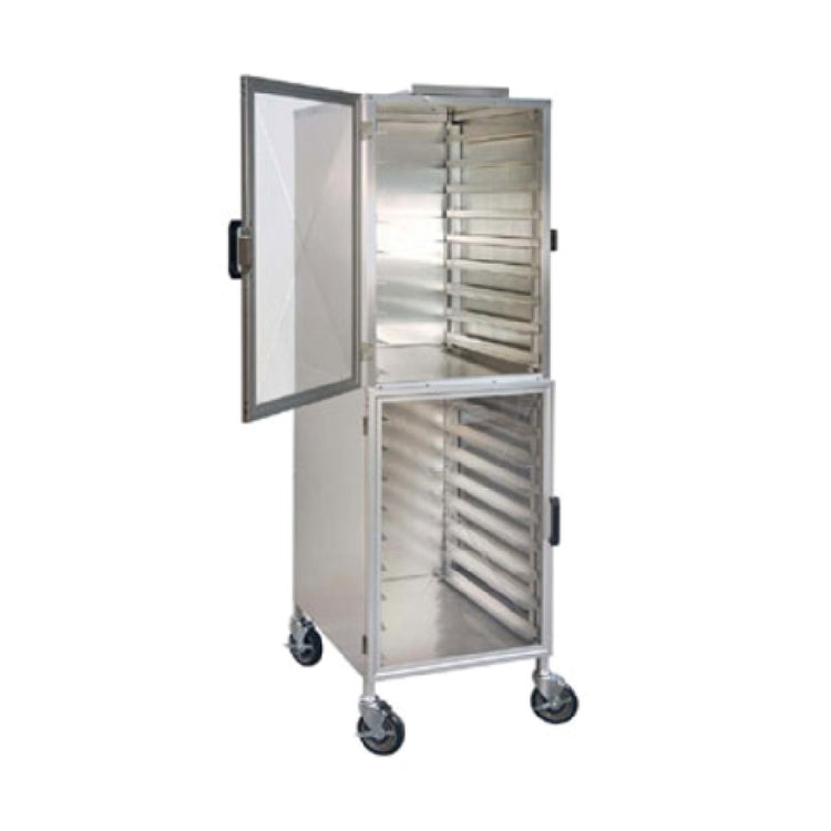 The Dinex DXPER18L Display Cabinet is a versatile and robust storage solution, measuring 21-1/2" wide and featuring two compartments. This cabinet is equipped with four removable slide racks, each with a spacing of 3-1/4", allowing it to accommodate eighteen 18" x 26" sheet pans. Its design includes two removable left-hinged Lexan doors with magnetic closures, providing easy access and secure storage. An adjustable top vent ensures optimal air circulation, making it suitable for various storage needs. The cabinet boasts a substantial weight capacity of 350 lbs., making it an excellent choice for high-volume environments. For mobility, it includes four 5" heavy-duty swivel casters, with two casters featuring brakes to maintain stability. This display cabinet is ideal for commercial kitchens, bakeries, and catering services, offering a reliable storage solution that meets the demands of different markets within the food service industry. Its sturdy construction and functional design make the Dinex DXPER18L a valuable asset for any professional setting, ensuring efficiency and ease of use.