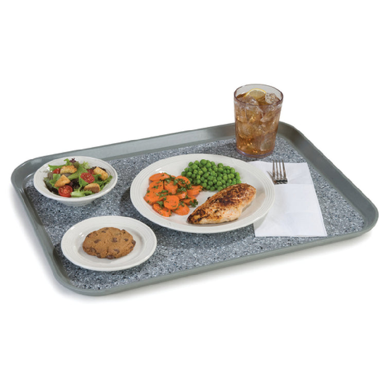The Dinex DXSMC1418NSM23 Patient Tray 14" x 18" Molded-in Non-skid Surface is a meticulously crafted solution for healthcare facilities, designed to enhance patient dining experiences with safety and durability in mind. Measuring 14 inches by 18 inches, this tray features a molded-in non-skid surface that ensures stability, reducing the risk of spills during meal transport. It is constructed from durable fiberglass, a material known for its strength and resilience, making the tray stain, scratch, and odor resistant. The reinforced edges provide additional strength, extending the product's longevity even under frequent use. The tray's gray with gray marble design adds a touch of elegance while maintaining a professional appearance that complements various healthcare environments. As a dishwasher-safe product, it supports efficient sanitation processes, which is crucial in maintaining high hygiene standards in medical facilities. This tray meets NSF standards, verifying its compliance with public health and safety requirements. Available in cases of 12, the Dinex DXSMC1418NSM23 is an ideal choice for hospitals, nursing homes, and other healthcare institutions aiming to provide reliable, high-quality service in patient meal delivery.
