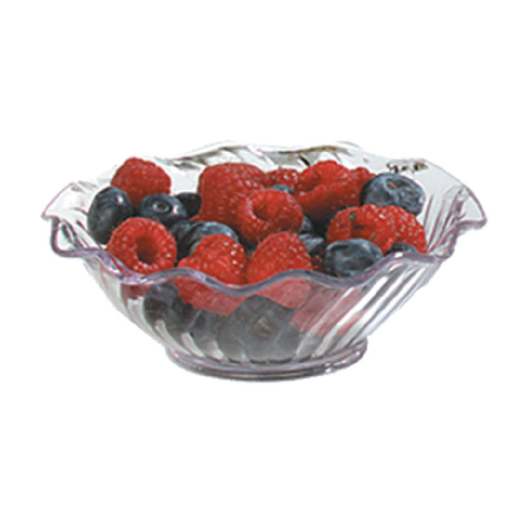 The Dinex DXSWC607 Berry Bowl 5 oz. - 4-5/8" dia. x 1-5/8"H is a versatile and practical solution for food service providers looking to enhance their presentation and functionality. With a capacity of 5 ounces, this berry bowl is ideal for serving a variety of small dishes, making it a suitable choice for cafeterias, catering events, and healthcare facilities. Featuring a swirl design, it adds an aesthetic appeal to any table setting. Engineered with clear SAN material, this bowl ensures durability and shatter resistance, while being BPA-free to prioritize the safety of its users. Its dishwasher-safe property streamlines the cleaning process, offering convenience for busy food service environments. Measuring 4-5/8 inches in diameter and 1-5/8 inches in height, this bowl is compact yet sufficiently sized for individual servings. The Dinex DXSWC607 is NSF certified, attesting to its compliance with rigorous public health and safety standards, ensuring it meets the demands of professional kitchens. Packaged with 96 units per case, this product is an economical option for bulk purchases, catering to large-scale operations. The Dinex DXSWC607 Berry Bowl seamlessly combines functionality, safety, and style, making it an essential component for diverse segment markets within the food service industry.